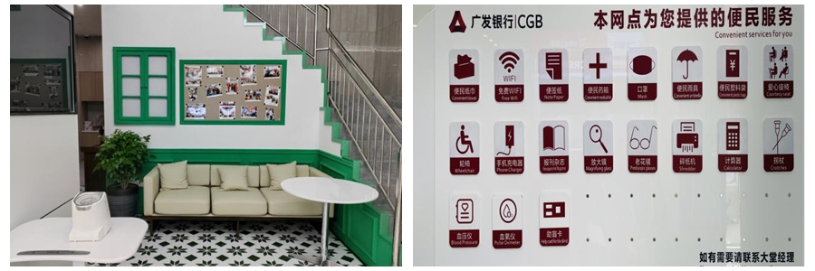 老有所得,適老改造增特色。堅持以人為本,不斷在硬件設(shè)施的功能性、實用性、針對性上下功夫,一是升級網(wǎng)點設(shè)施,為行動不便的老年人設(shè)置無障礙通道、無障礙衛(wèi)生間,配備輪椅、拐杖、放大鏡、不同度數(shù)老花鏡、血壓血氧計、便民藥箱等適老化便民設(shè)施;二是打造服務(wù)專區(qū),廣泛調(diào)研長者客戶喜聞樂見的專區(qū)物件與配色布局,長者服務(wù)專區(qū)整體為懷舊設(shè)計,通過物件配置與空間改裝形成特色功能區(qū),長者客戶可在長者服務(wù)專區(qū)結(jié)伴閑坐聊天、享受自助閱讀、免費測量血壓、瀏覽活動趣聞等,感受到賓至如歸的舒適體驗。