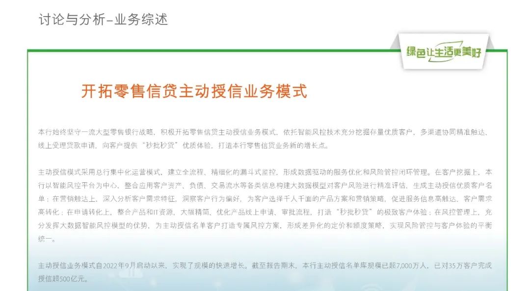 在零售風(fēng)控領(lǐng)域,該行研發(fā)主動授信模式,深度挖掘優(yōu)質(zhì)存量客戶,提供秒批秒貸服務(wù),實現(xiàn)風(fēng)險管控與客戶體驗的平衡統(tǒng)一;推進(jìn)零售信貸自動化審批,降低分支機(jī)構(gòu)信貸審批人員工作量一半以上,穩(wěn)步提升客戶質(zhì)量。