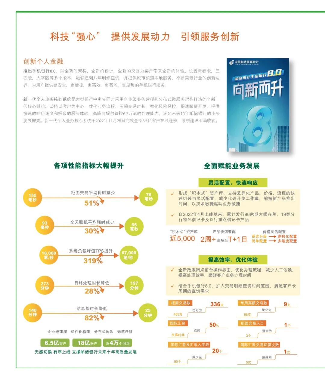 2022年,郵儲銀行新一代個人業(yè)務(wù)核心系統(tǒng)全面上線,從IT基礎(chǔ)設(shè)施、系統(tǒng)軟件、企業(yè)級技術(shù)平臺、應(yīng)用軟件全層面全體系,從業(yè)務(wù)創(chuàng)新、系統(tǒng)研發(fā)、生產(chǎn)運(yùn)營全過程全周期,實現(xiàn)關(guān)鍵技術(shù)自主可控,同時也是大型銀行中率先同時采用企業(yè)級業(yè)務(wù)建模和分布式微服務(wù)架構(gòu)打造的全新一代核心系統(tǒng)。