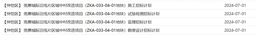 近日,惠州市公共資源交易中心連發(fā)4條公告,均與莞惠城際沿線片區(qū)城中村改造項(xiàng)目ZKA-033-04-01地塊有關(guān),包括施工招標(biāo)、勘探設(shè)計(jì)招標(biāo)、監(jiān)理招標(biāo)以及試驗(yàn)檢測(cè)招標(biāo)等,預(yù)示著這宗仲愷城市改造地塊已進(jìn)入了實(shí)質(zhì)性進(jìn)展階段。