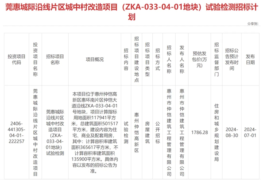 7月1日,據(jù)惠州市公共資源交易中心信息,莞惠城際沿線片區(qū)城中村改造項(xiàng)目(ZKA-033-04-01地塊)發(fā)布施工招標(biāo),預(yù)計(jì)發(fā)包價(jià)為178627.77萬(wàn)元。