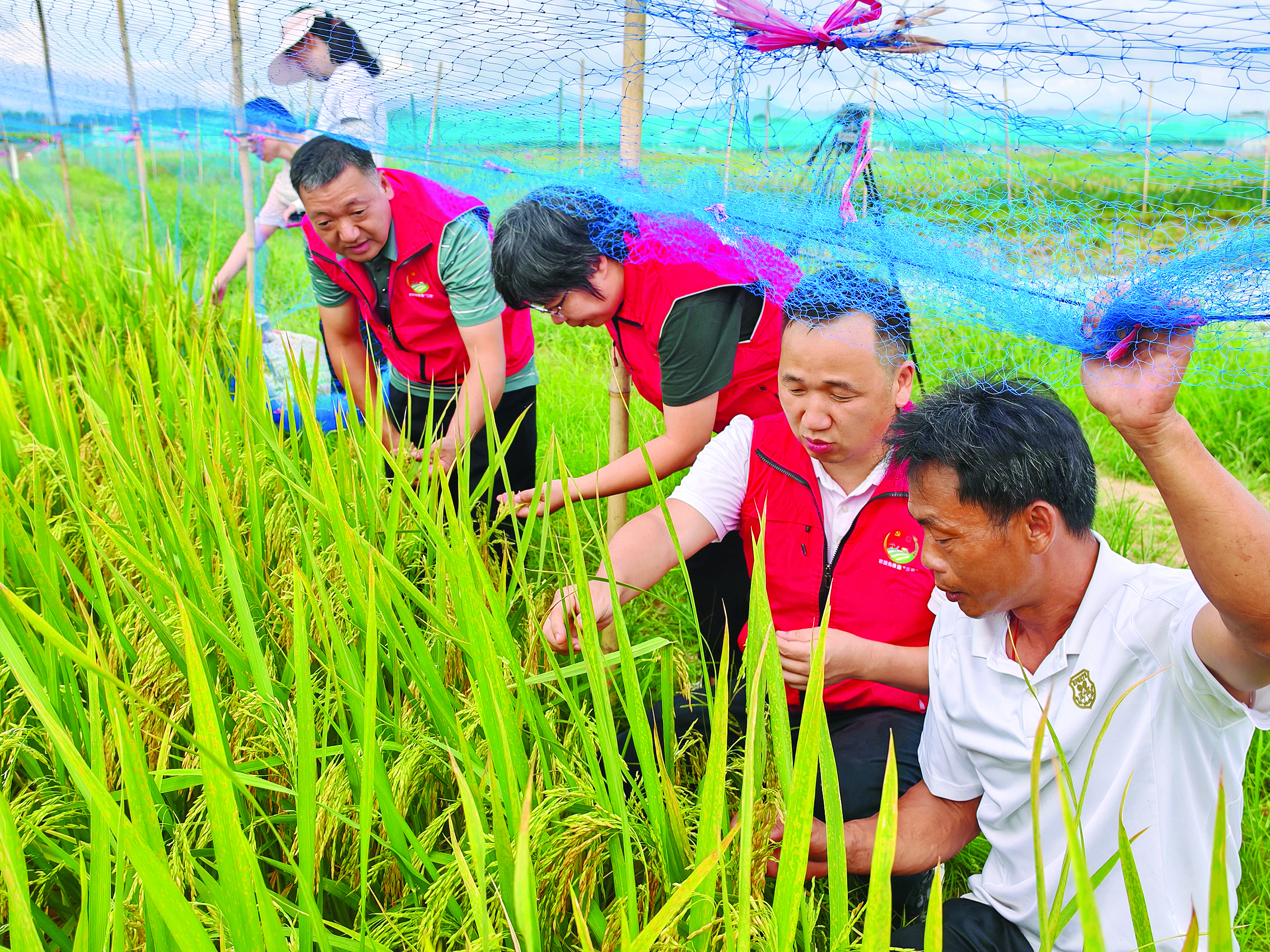 糧食安全農(nóng)技先鋒崗黨員為水稻種植戶(hù)答疑解惑。