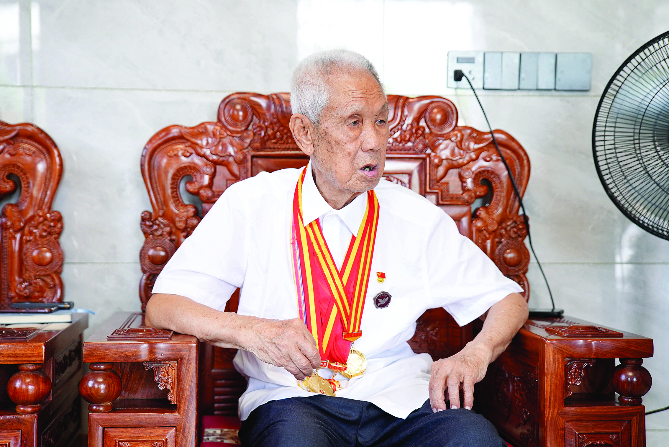 “等我五分鐘,馬上就好!币贿M(jìn)客廳,李書湘招呼我們?nèi)胱,轉(zhuǎn)身就離開了!奥犝f你們要來采訪,很高興!換新衣服去了!痹趶埬棠虡泛呛堑男β曋,穿著嶄新白襯衫,胸前佩戴黨員徽章、掛著勛章的李書湘坐到了沙發(fā)上,開始和我們分享他的故事。