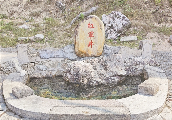 在中洞改編紀(jì)念雕塑的正對(duì)面,有一口水井靜靜佇立,這便是有名的紅軍井。三月正午的天氣略有熱意,井水依然清涼澄澈,周邊居民仍在使用!靶⌒〖t軍井,清清水兩方。涓涓流不斷,漾漾萬年長(zhǎng)。講講紅故事,人人當(dāng)自強(qiáng)。儕儕心向黨,代代好兒郎。”這一首朗朗上口的詩句描述的就是它。