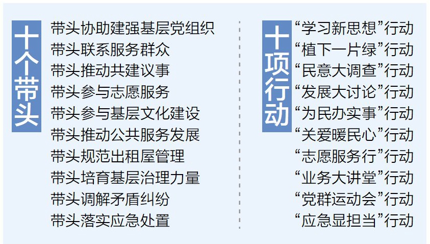 “十個帶頭”,即帶頭協(xié)助建強基層黨組織、帶頭聯(lián)系服務群眾、帶頭推動共建議事、帶頭參與志愿服務、帶頭參與基層文化建設、帶頭推動公共服務發(fā)展、帶頭規(guī)范出租屋管理、帶頭培育基層治理力量、帶頭調(diào)解矛盾糾紛、帶頭落實應急處置。