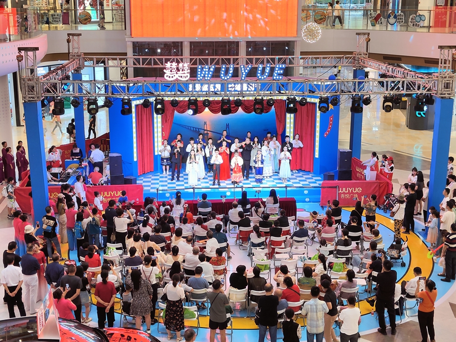 在吾悅廣場,樂器合奏《再吹山歌給黨聽》拉開了當天活動的帷幕,動人的旋律剛響起,不少市民紛紛駐足聆聽欣賞,熱鬧的商場瞬間化身音樂的海洋,還有不少市民拿起手機記錄下精彩的表演。