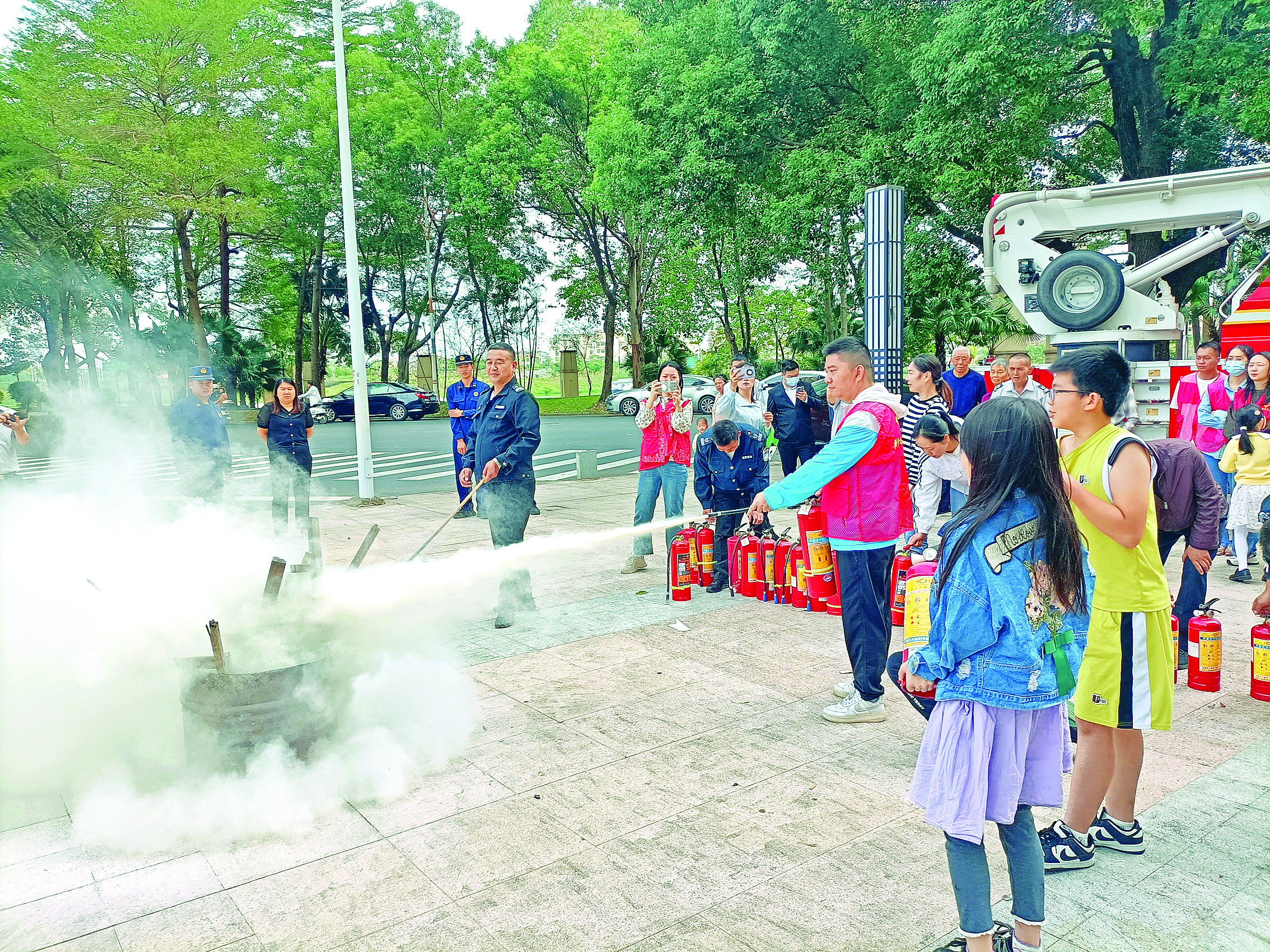 東平消防救援站還特意將19米舉高噴射消防車開到了現(xiàn)場。這輛消防車以其強大的功能和出色的表現(xiàn),贏得了現(xiàn)場居民的陣陣驚嘆。當(dāng)水流從高空噴射而出時,整個活動現(xiàn)場的氣氛被推向了高潮。