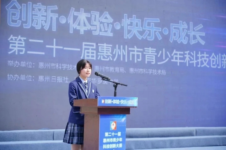 溫家綺在第二十一屆惠州市青少年科技創(chuàng)新大賽上發(fā)言。