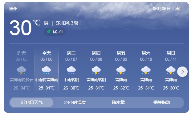 具體來說,6月6日,我市天氣多云,有雷陣雨,局部大雨到暴雨,25~33℃;7日,中到強(qiáng)雷雨,局部暴雨,25~32℃;8~9日,多云,有雷陣雨,局部大雨。