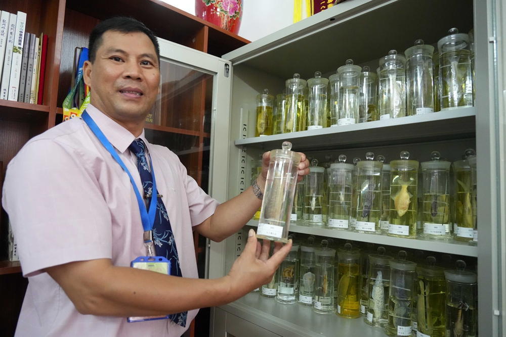 龍門縣龍城第一中學特級生物教師黃偉勝,主持龍門縣原生魚資源調(diào)查研究課題,收集105種龍門原生魚。圖為他自制的各種魚標本。