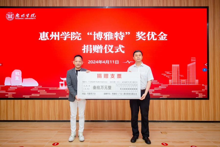 近日,惠州學院舉行“博雅特”獎優(yōu)金項目捐贈儀式。該校2006屆財務管理專業(yè)校友葉治斌捐贈設立“博雅特”獎優(yōu)金,該項目旨在表彰和鼓勵母校在學科競賽、學業(yè)、領導力和社會服務等方面表現(xiàn)卓越的學生和作出突出貢獻的教職工。
