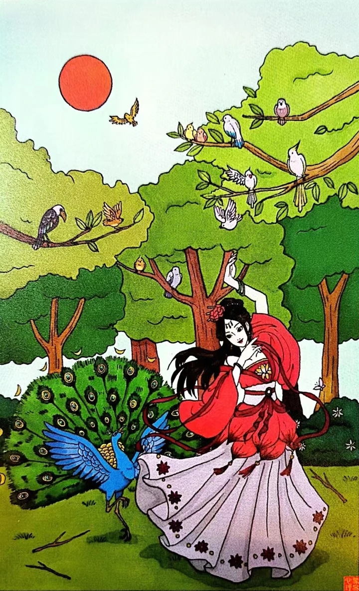 一個(gè)美麗的女孩在大自然中跳舞,旁邊有很多的小動(dòng)物。