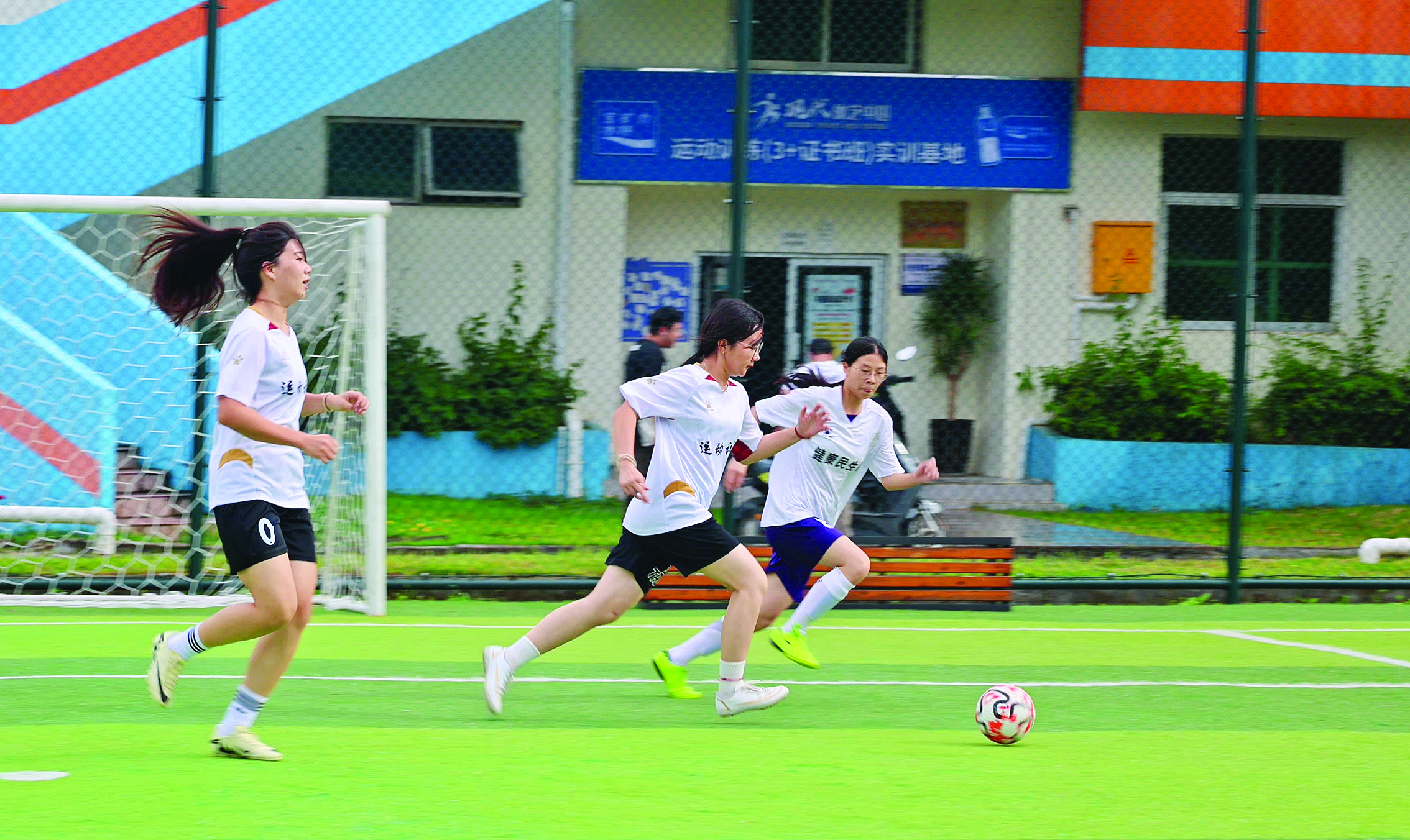 目前,學(xué)校開設(shè)定向越野、羽毛球、乒乓球、籃球、健身、足球、田徑、武術(shù)、啦啦操(健美操)等9個(gè)選課項(xiàng)目,同時(shí)將體育勞動(dòng)課、游泳、八段錦、軍教體融合課設(shè)為必修課。此外,學(xué)校每周還專設(shè)一節(jié)體育活動(dòng)課,確保學(xué)生每天都能參與體育鍛煉,為全面發(fā)展提供堅(jiān)實(shí)保障。這種模式既滿足了學(xué)生的個(gè)性化需求,也讓教師能發(fā)揮專業(yè)特長(zhǎng)。足球?qū)m?xiàng)教師展示精湛顛球技藝,健身專項(xiàng)教師系統(tǒng)講解動(dòng)作要領(lǐng),體育舞蹈特長(zhǎng)教師帶領(lǐng)啦啦操訓(xùn)練……教師的專業(yè)魅力成為吸引學(xué)生主動(dòng)參與的重要力量。