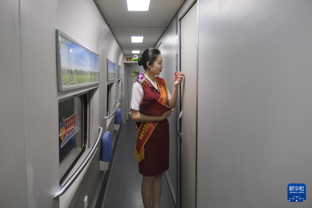 D910次列車乘務(wù)員準備向包廂內(nèi)的旅客發(fā)放紀念品(6月15日攝)。新華社記者 王申 攝