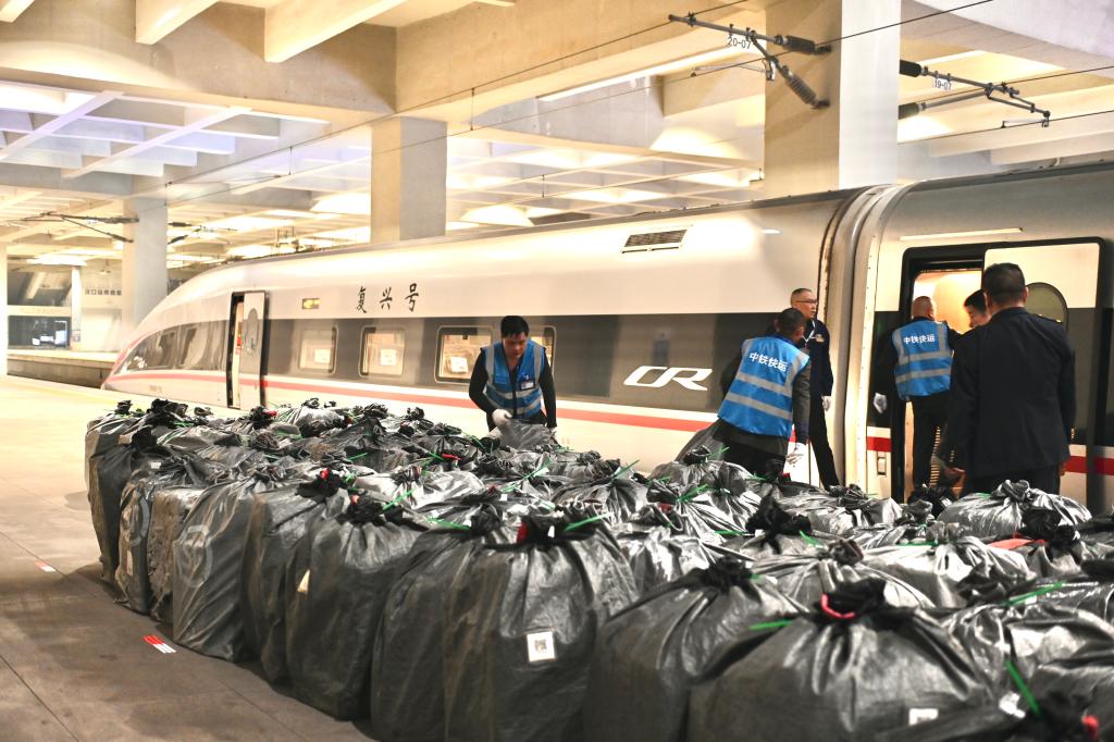 11月15日,漢口站站臺上,鐵路工作人員正將包裹搬進高鐵車廂。(受訪單位供圖)