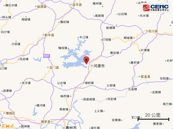 震中距源城區(qū)7公里、距東源縣11公里、距龍門縣39公里、距新豐縣55公里、距紫金縣57公里,距河源市6公里,距廣州市157公里。