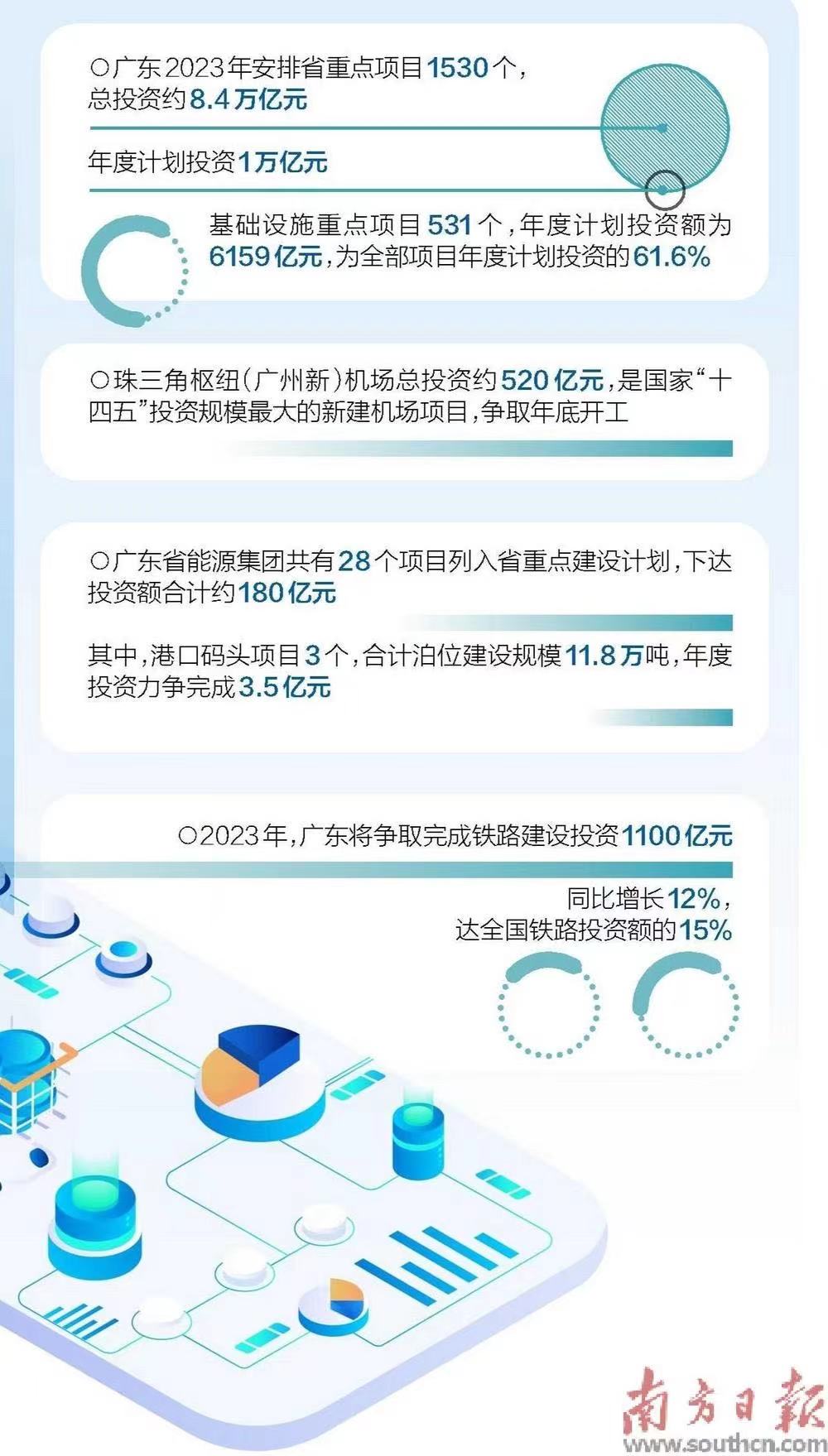 經(jīng)濟(jì)第一大省廣東在全省高質(zhì)量發(fā)展大會(huì)特別設(shè)置了“狠抓重點(diǎn)項(xiàng)目、重大平臺(tái)建設(shè),全力推動(dòng)有效投資落地落實(shí)”分會(huì)場(chǎng)。會(huì)上,廣東公布,2023年全省共安排省重點(diǎn)項(xiàng)目1530個(gè),總投資8.4萬億元,年度計(jì)劃投資1萬億元。其中,基礎(chǔ)設(shè)施重點(diǎn)項(xiàng)目531個(gè),年度計(jì)劃投資額為6159億元,為全部項(xiàng)目年度計(jì)劃投資的61.6%。