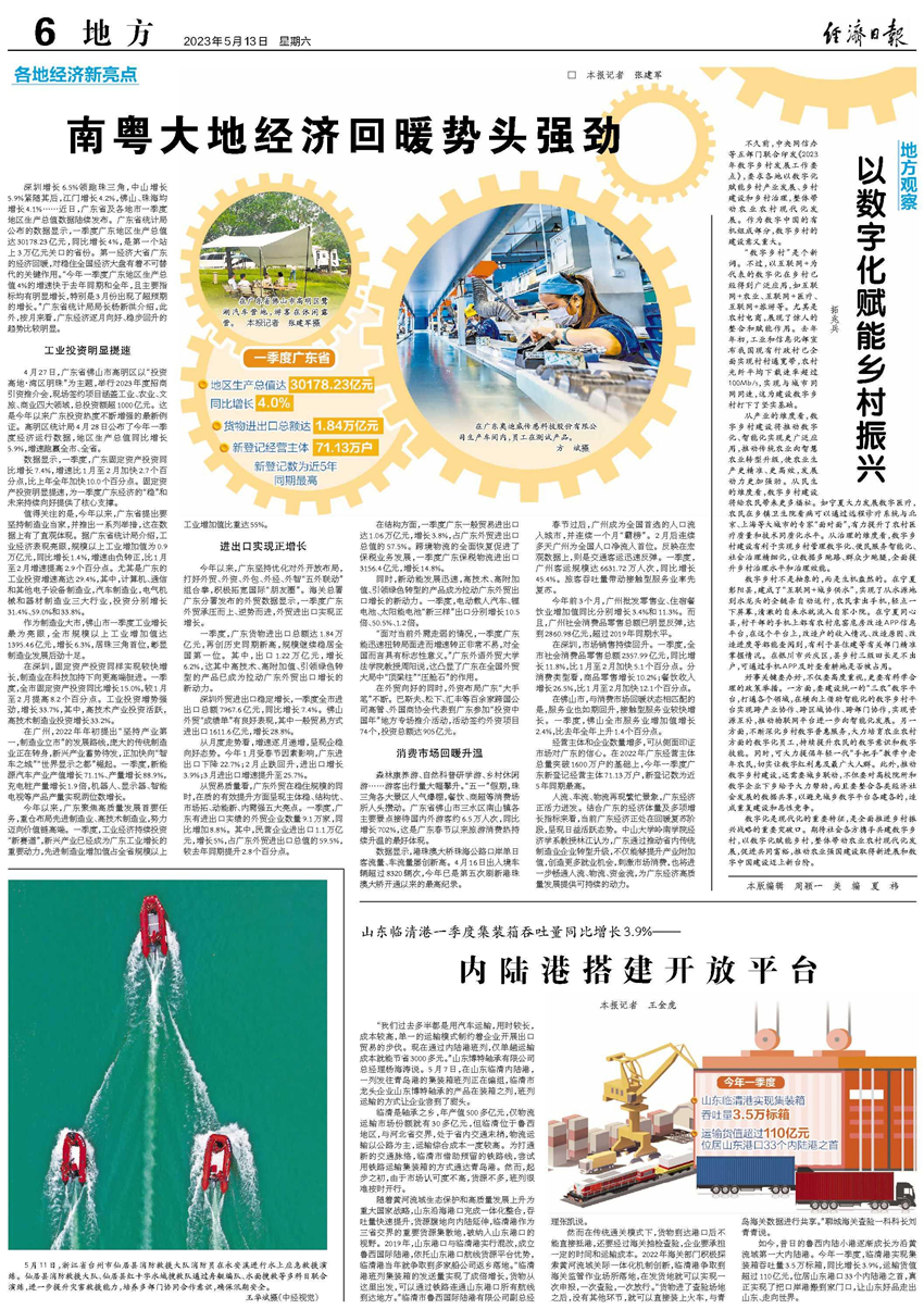 深圳增長6.5%領跑珠三角,中山增長5.9%緊隨其后,江門增長4.2%,佛山、珠海均增長4.1%……近日,廣東省及各地市一季度地區(qū)生產(chǎn)總值數(shù)據(jù)陸續(xù)發(fā)布。廣東省統(tǒng)計局公布的數(shù)據(jù)顯示,一季度廣東地區(qū)生產(chǎn)總值達30178.23億元,同比增長4%,是第一個站上3萬億元關口的省份。第一經(jīng)濟大省廣東的經(jīng)濟回暖,對穩(wěn)住全國經(jīng)濟大盤有著不可替代的關鍵作用!敖衲暌患径葟V東地區(qū)生產(chǎn)總值4%的增速快于去年同期和全年,且主要指標均有明顯增長,特別是3月份出現(xiàn)了超預期的增長。”廣東省統(tǒng)計局局長楊新洪介紹,此外,按月來看,廣東經(jīng)濟逐月向好、穩(wěn)步回升的趨勢比較明顯。