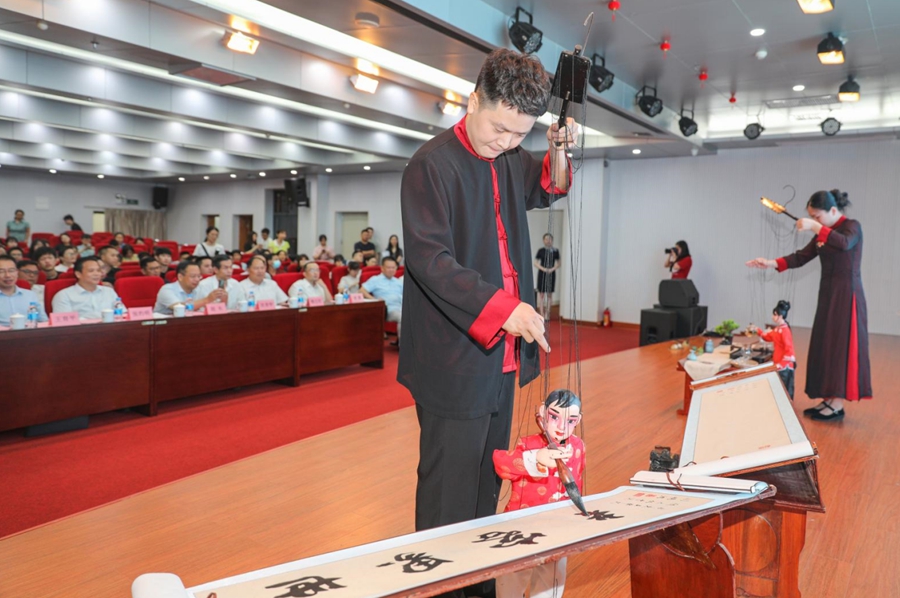 首屆移動杯梅州客家非遺文創(chuàng)設(shè)計大賽啟動儀式木偶書法作品展示。吳騰江 攝