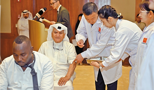 9月11日,在科威特大穆巴拉克省,中國(guó)援科威特醫(yī)療隊(duì)隊(duì)員展示中醫(yī)針灸。目前中醫(yī)藥已推廣至196個(gè)國(guó)家和地區(qū)。(圖/新華社)