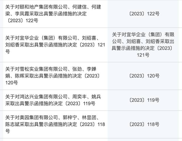 近日,廣東證監(jiān)局集中公布了多份行政監(jiān)管措施決定書(shū)。主要對(duì)奧園集團(tuán)、鴻達(dá)興業(yè)集團(tuán)、雪松實(shí)業(yè)集團(tuán)、宜華企業(yè)、頤和地產(chǎn)等企業(yè)及相關(guān)責(zé)任人做出采取出具警示函措施的決定。主要原因是其作為公司債券發(fā)行人,未在規(guī)定期限內(nèi)披露年度報(bào)告或半年度報(bào)告等。這一行為違反了《公司債券發(fā)行與交易管理辦法》(證監(jiān)會(huì)令第180號(hào))第四條、第五十條、第五十一條第一款的規(guī)定。按照決定書(shū),前述公司應(yīng)于收到?jīng)Q定書(shū)30日內(nèi)向廣東證監(jiān)局報(bào)送整改報(bào)告,并抄報(bào)上海證券交易所、深圳證券交易所。