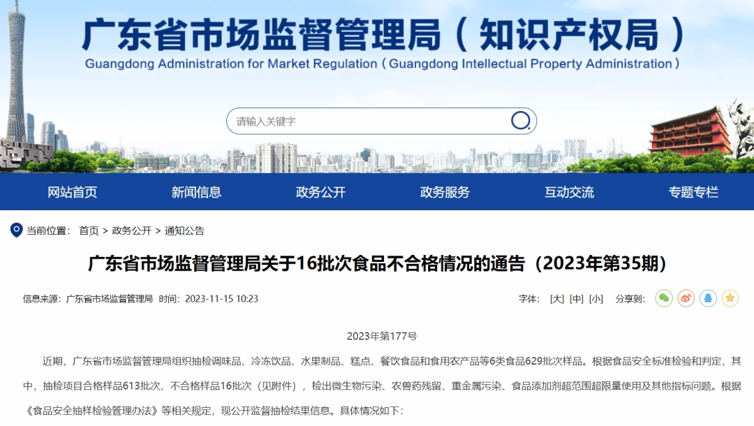 近日,廣東省市場(chǎng)監(jiān)督管理局發(fā)布關(guān)于16批次食品不合格情況的通告(2023年第35期),詳情如下: