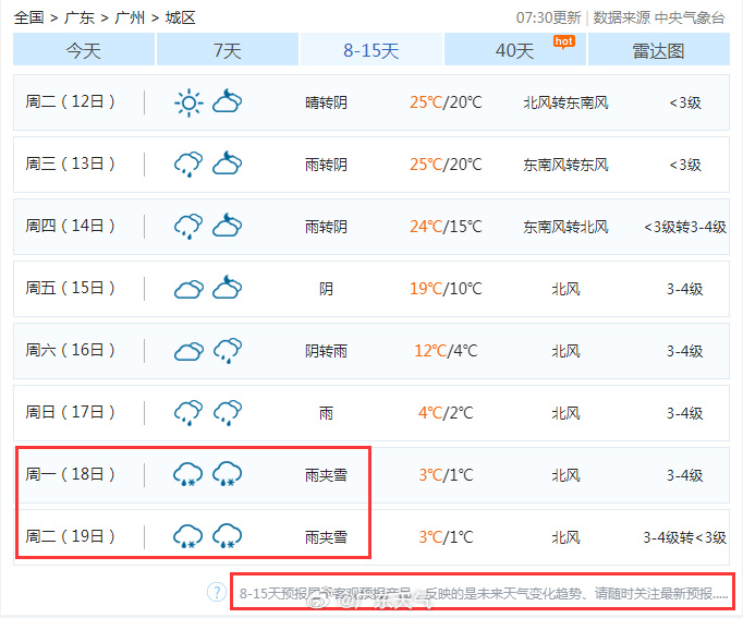 昨天,不少網(wǎng)友從“8-15天趨勢預(yù)報(bào)”中發(fā)現(xiàn)廣州12月中下旬有雨夾雪。