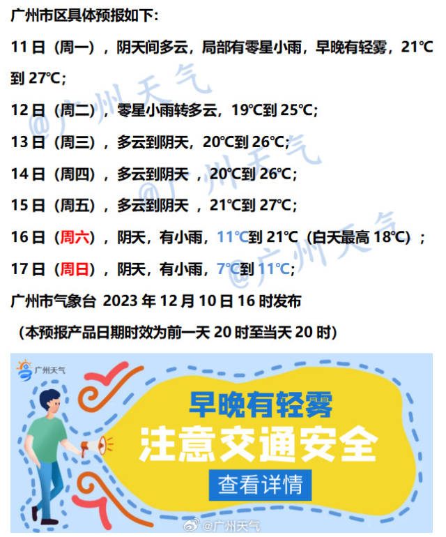 按廣州市氣象臺(tái)的一周天氣預(yù)測(cè)看,16日(周六)、17日(周日)廣州最低氣溫將從前一天的20℃左右驟降至7℃-11℃。大家可以提前準(zhǔn)備起防寒的衣物了。