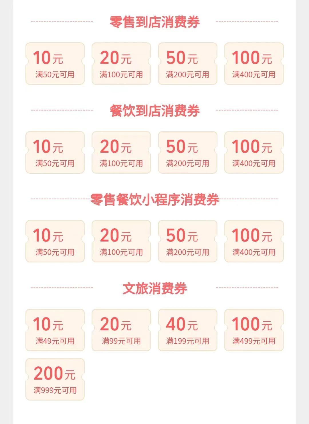 本次活動共有四類消費券:零售到店消費券、餐飲到店消費券、零售餐飲小程序消費券、文旅消費券。消費券采取滿額立減方式。