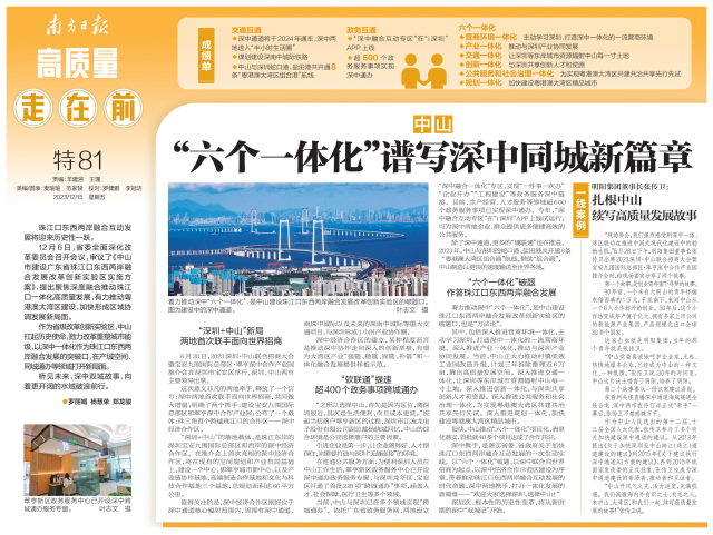 著力推動深中“六個一體化”,是中山建設珠江口東西兩岸融合互動發(fā)展改革創(chuàng)新實驗區(qū)的破題口,也是“方法論”。