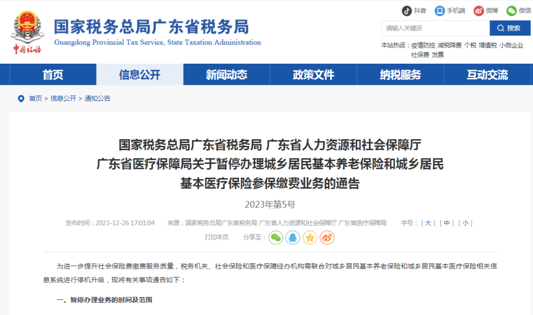據(jù)國(guó)家稅務(wù)總局廣東省稅務(wù)局網(wǎng)站消息,國(guó)家稅務(wù)總局廣東省稅務(wù)局、廣東省人力資源和社會(huì)保障廳、廣東省醫(yī)療保障局發(fā)布《關(guān)于暫停辦理城鄉(xiāng)居民基本養(yǎng)老保險(xiǎn)和城鄉(xiāng)居民基本醫(yī)療保險(xiǎn)參保繳費(fèi)業(yè)務(wù)的通告》(以下簡(jiǎn)稱(chēng)《通告》)。