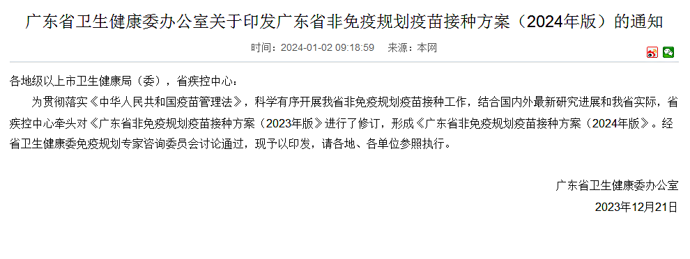 《廣東省非免疫規(guī)劃疫苗接種方案(2024年版)》(下稱《方案》)