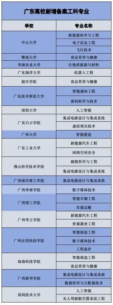 比如,中山大學(xué)新增新能源科學(xué)與工程專(zhuān)業(yè)、廣東工業(yè)大學(xué)新增新能源汽車(chē)工程專(zhuān)業(yè)等;佛山科學(xué)技術(shù)學(xué)院新增儲(chǔ)能科學(xué)與工程專(zhuān)業(yè)、廣州大學(xué)新增智能建造專(zhuān)業(yè)、廣東技術(shù)師范大學(xué)新增智能感知工程、珠海科技學(xué)院新增智能制造工程專(zhuān)業(yè)等。