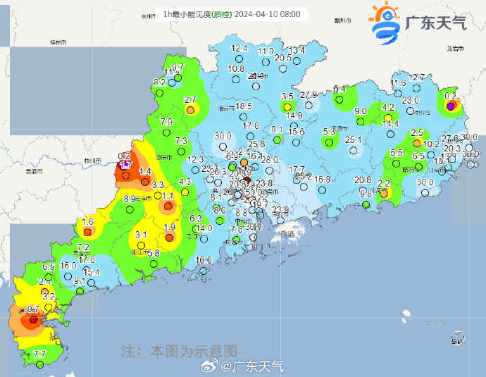 此外,今天8時,開封和大埔縣能見度低于200米,雷州、德慶、郁南等地能見度低于2公里。截至8時10分,開封和德慶的大霧橙色預(yù)警生效,恩平大霧黃色預(yù)警生效中。個別地方能見度較低,駕車出行要注意交通安全,注意控距,降速、亮尾。