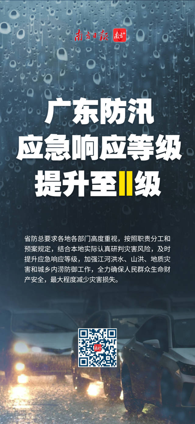 根據(jù)氣象、水文部門監(jiān)測預(yù)報,廣東省中北部市縣多地出現(xiàn)大暴雨、局部特大暴雨,江河洪水快速上漲,且未來強降雨過程將持續(xù),防汛形勢十分嚴(yán)峻。根據(jù)《廣東省防汛防旱防風(fēng)防凍應(yīng)急預(yù)案》和省防總有關(guān)規(guī)定,廣東省防汛防旱防風(fēng)總指揮部決定于4月20日18時將防汛Ⅲ級應(yīng)急響應(yīng)提升至Ⅱ級。