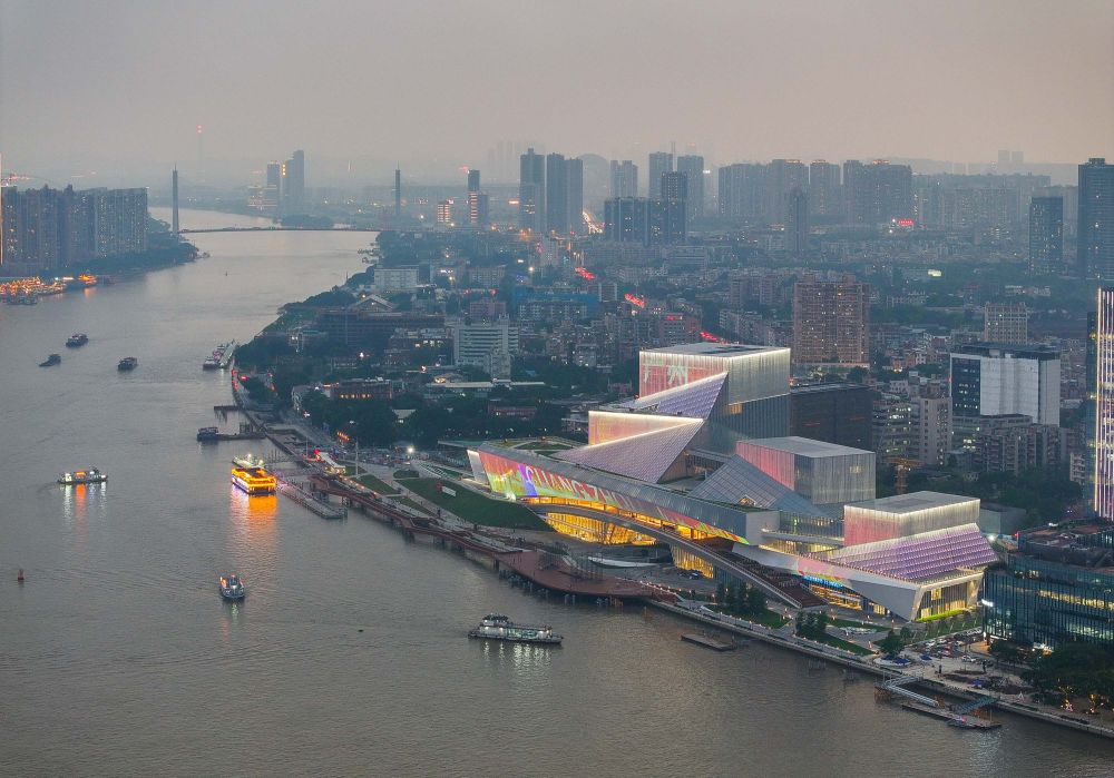 莽莽珠江貫五嶺,奔千里,匯灣區(qū),入南海。在珠江流經(jīng)廣州的對外交通要道白鵝潭處,一棟典雅壯麗的場館巍然矗立,如同一艘巨輪泊于江岸、風帆正舉。