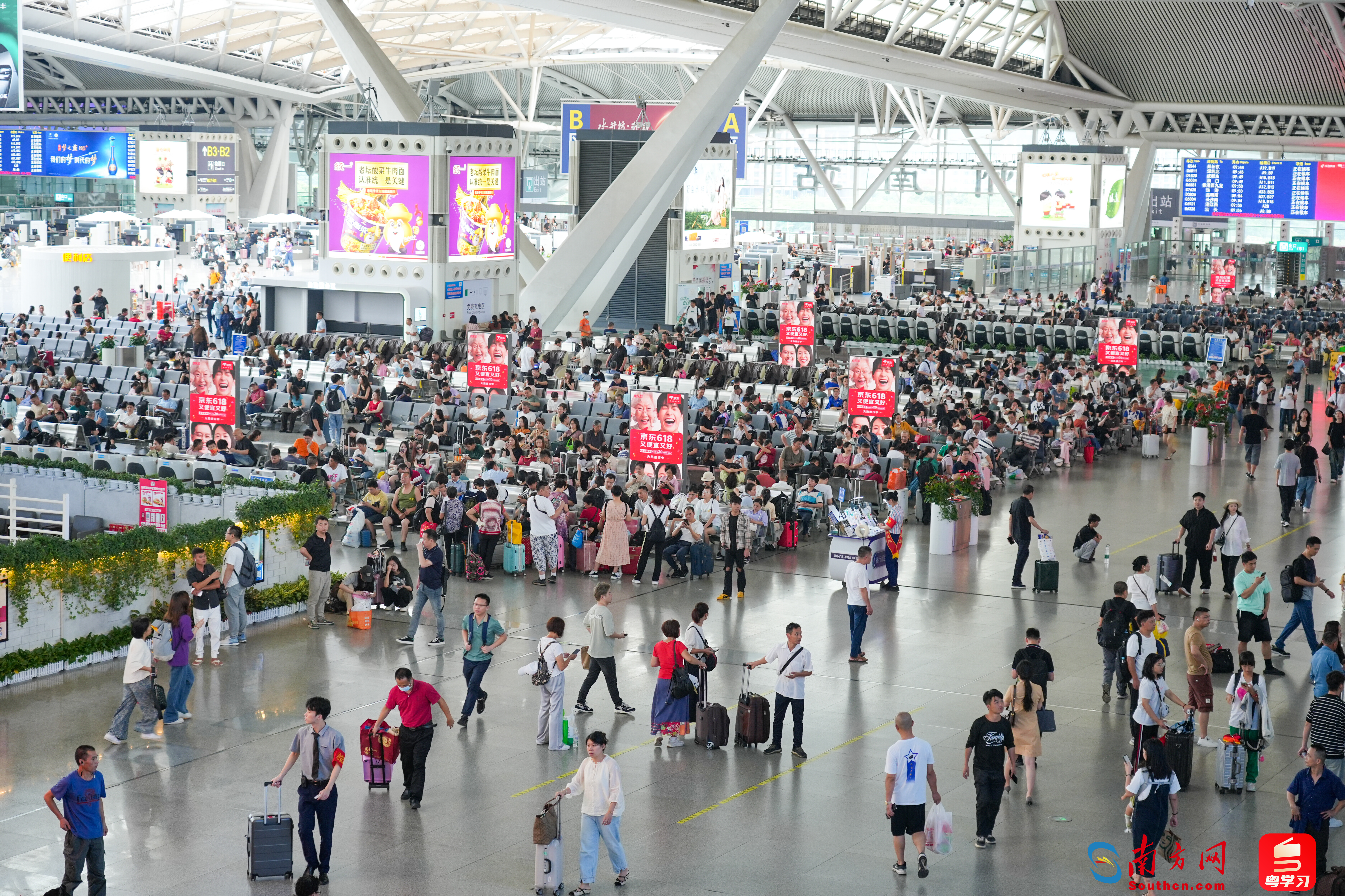 為應(yīng)對(duì)暑運(yùn)期間持續(xù)大客流,廣鐵集團(tuán)出臺(tái)多項(xiàng)措施,方便旅客出行。廣州南站根據(jù)客流情況靈活調(diào)整車站驗(yàn)證、安檢、檢票通道,提高旅客快速進(jìn)出站效率。在實(shí)名制驗(yàn)證區(qū)域、安檢區(qū)域設(shè)置“急客通道”,為開車前15分鐘內(nèi)的旅客提供快速進(jìn)站服務(wù)。深圳北站根據(jù)暑運(yùn)期間的客流特點(diǎn),設(shè)置不同的候車室,如愛心候車區(qū)等,為老幼病殘?jiān)械忍厥饴每吞峁﹥?yōu)先候車、休息等服務(wù),滿足不同旅客的需求。