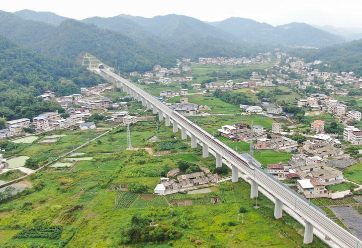 9月13日,復(fù)興號(hào)試驗(yàn)列車(chē)行駛在龍龍高鐵梅龍段葉屋特大橋上。
