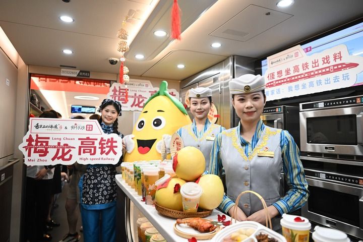 9月14日,鐵路工作人員在G8491次列車(chē)上慶祝龍龍高鐵梅龍段開(kāi)通運(yùn)營(yíng)。