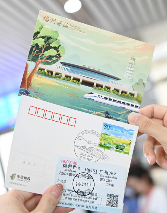9月14日,旅客在梅州西站手持郵政明信片和車(chē)票慶祝龍龍高鐵梅龍段開(kāi)通運(yùn)營(yíng)。