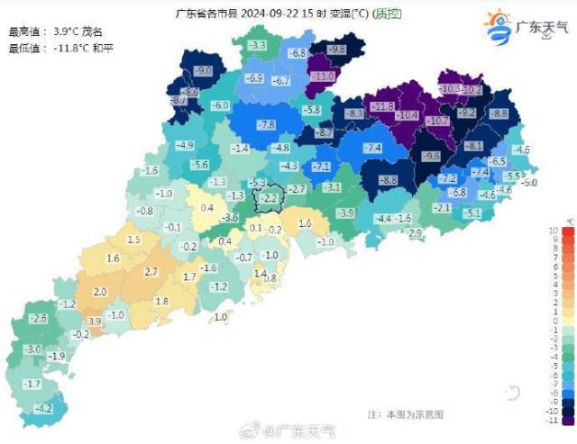 受冷空氣和降雨影響,截至22日15時(shí),粵北、珠三角、粵東地區(qū)氣溫普遍低于30℃,氣溫最低的和平錄得21.9℃,同比21日15時(shí)下降11.8℃。