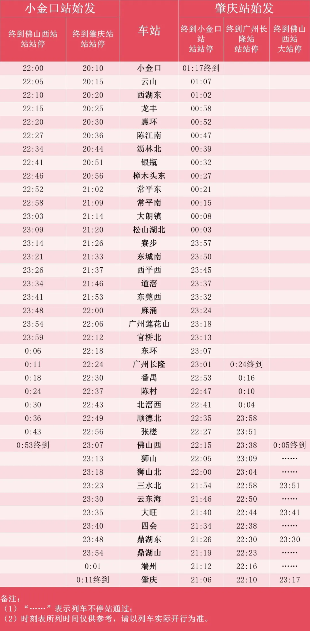 小金口往肇慶方向的站站停末班車在小金口站的發(fā)車時間將延長至20:10,在肇慶站的到達時間將延長至次日0:11;往佛山西站方向的站站停末班車在小金口站的發(fā)車時間將延長至22:00,在佛山西站的到達時間將延長至次日0:53。