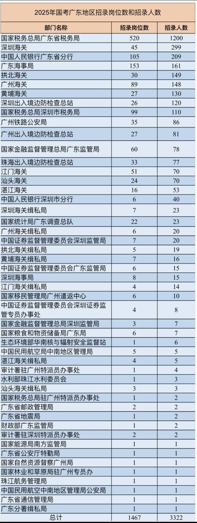 據(jù)統(tǒng)計,廣東地區(qū)有1467個崗位參加招考,招錄人數(shù)為3322人。其中,國家稅務(wù)總局廣東省稅務(wù)局招錄崗位和人數(shù)最多,分別為520個、1200人。