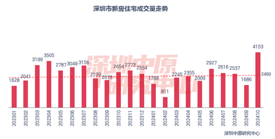 據(jù)深圳中原研究中心統(tǒng)計,今年10月,深圳全市一手住宅網(wǎng)簽4153套,環(huán)比上升146.3%,創(chuàng)35個月新高,也是自2021年12月之后首次突破4000套,成交面積40.8萬㎡,環(huán)比上升137.3%。