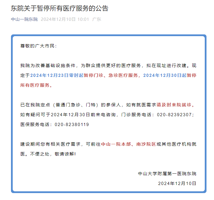 今天(12月10日)中山大學附屬第一醫(yī)院東院發(fā)布《東院關于暫停所有醫(yī)療服務的公告》。據(jù)了解,該院將進行改擴建,未來規(guī)劃定位為心腦血管疑難救治中心。據(jù)公告,該院于2024年12月23日零時起暫停門診、急診醫(yī)療服務,2024年12月30日起暫停所有醫(yī)療服務。