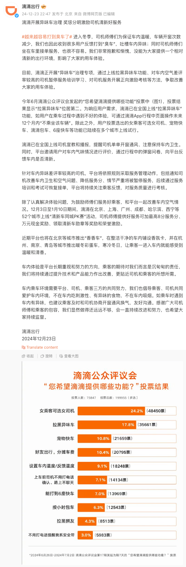 12月23日晚,@滴滴出行 發(fā)文稱,進(jìn)入冬季,司機(jī)為保證車內(nèi)溫暖,車輛開窗次數(shù)減少,滴滴也因此收到很多用戶反饋打到“臭車”,吐槽車內(nèi)異味。