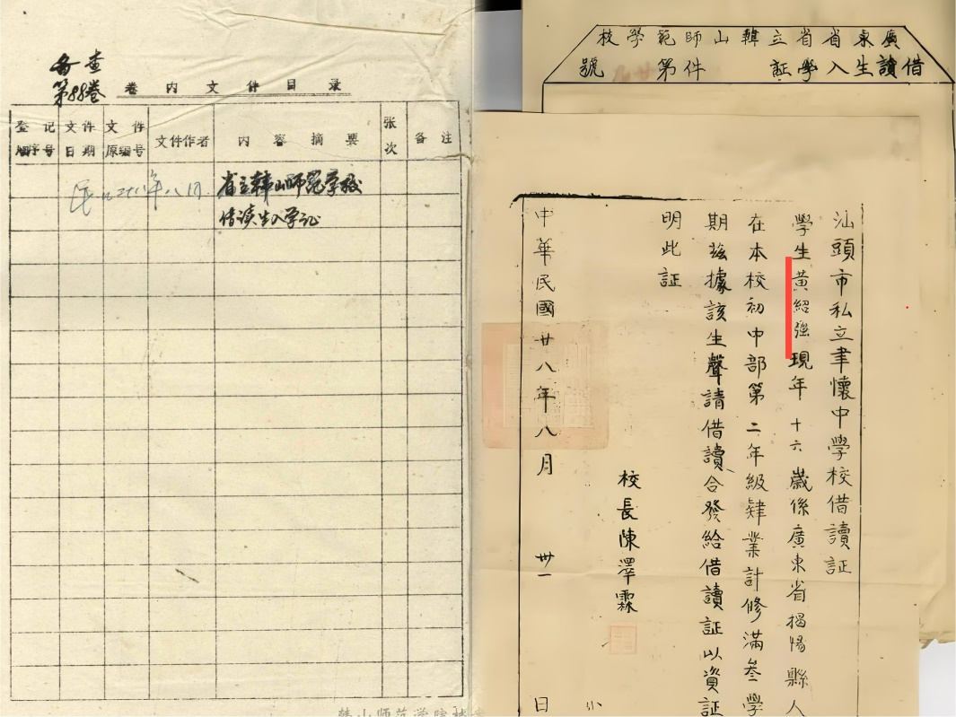 黃紹強(qiáng)的第廿九號(hào)借讀證。圖自韓師檔案