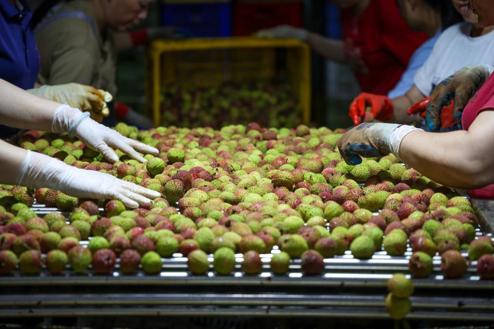 ↑6月4日,在廣東茂名高州市廣東銘景農業(yè)發(fā)展有限公司,工作人員在車間分揀即將運往海外的荔枝。