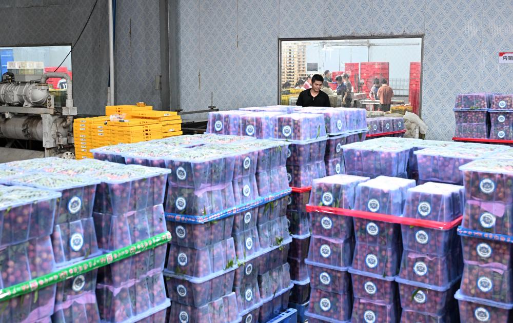 ↑6月4日,在廣東茂名高州市廣東銘景農業(yè)發(fā)展有限公司,工作人員在車間分揀荔枝。
