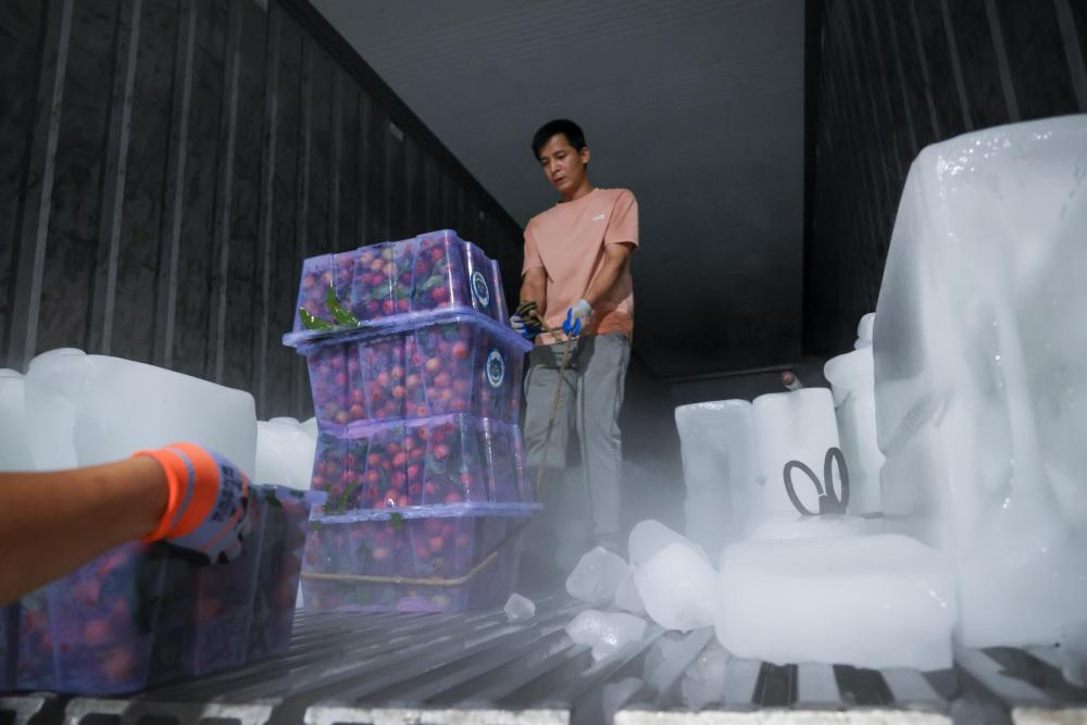 ↑6月4日,在廣東茂名高州市廣東銘景農業(yè)發(fā)展有限公司,工人將荔枝裝入放置了冰塊的冷鏈車。